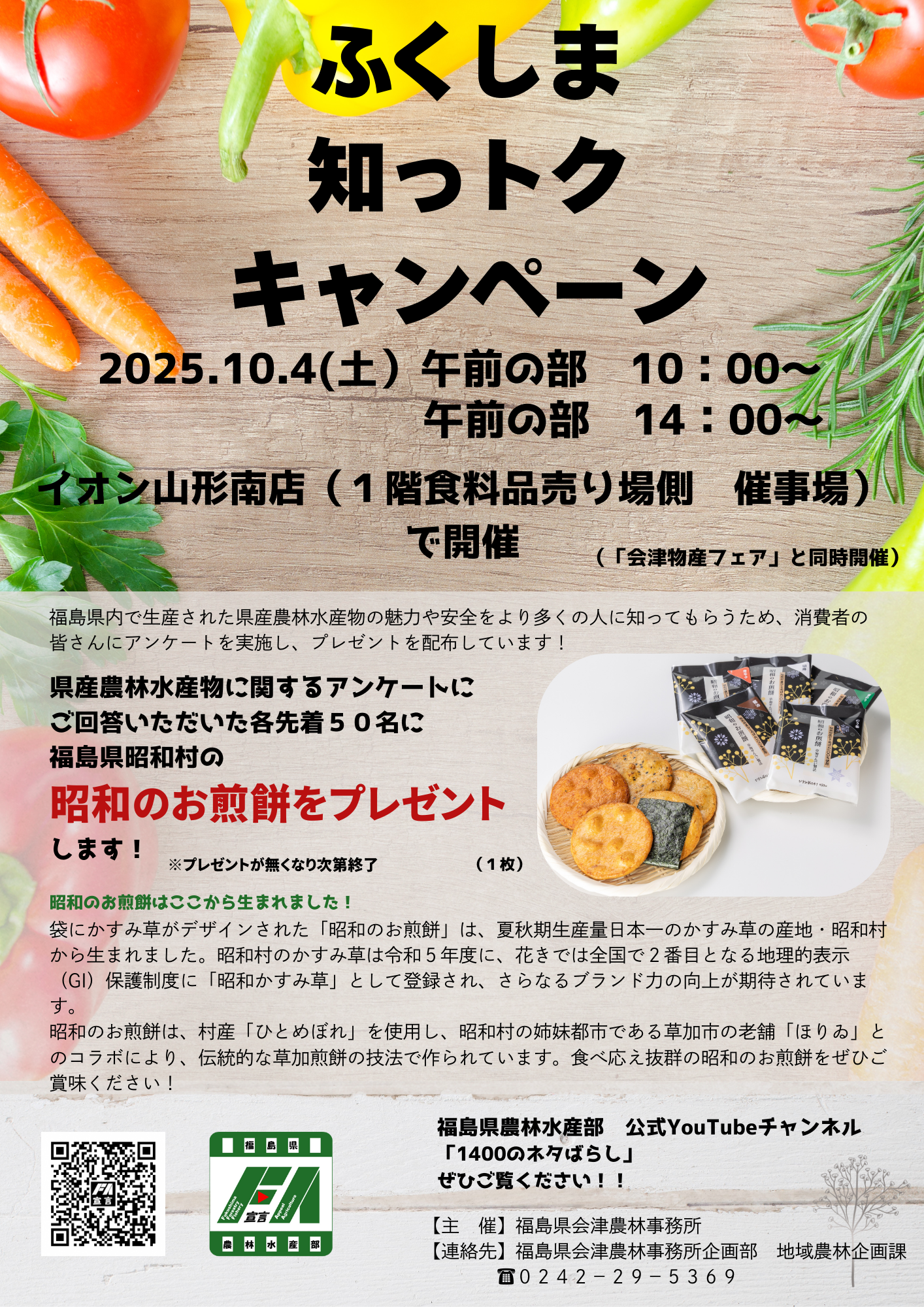 【内容】県産農林水産物等に関するアンケートにご回答いただいた先着50名様に、福島県昭和村の「昭和のお煎餅」をプレゼントし、山形県の皆さんに福島県産農林水産物の魅力をPRします。