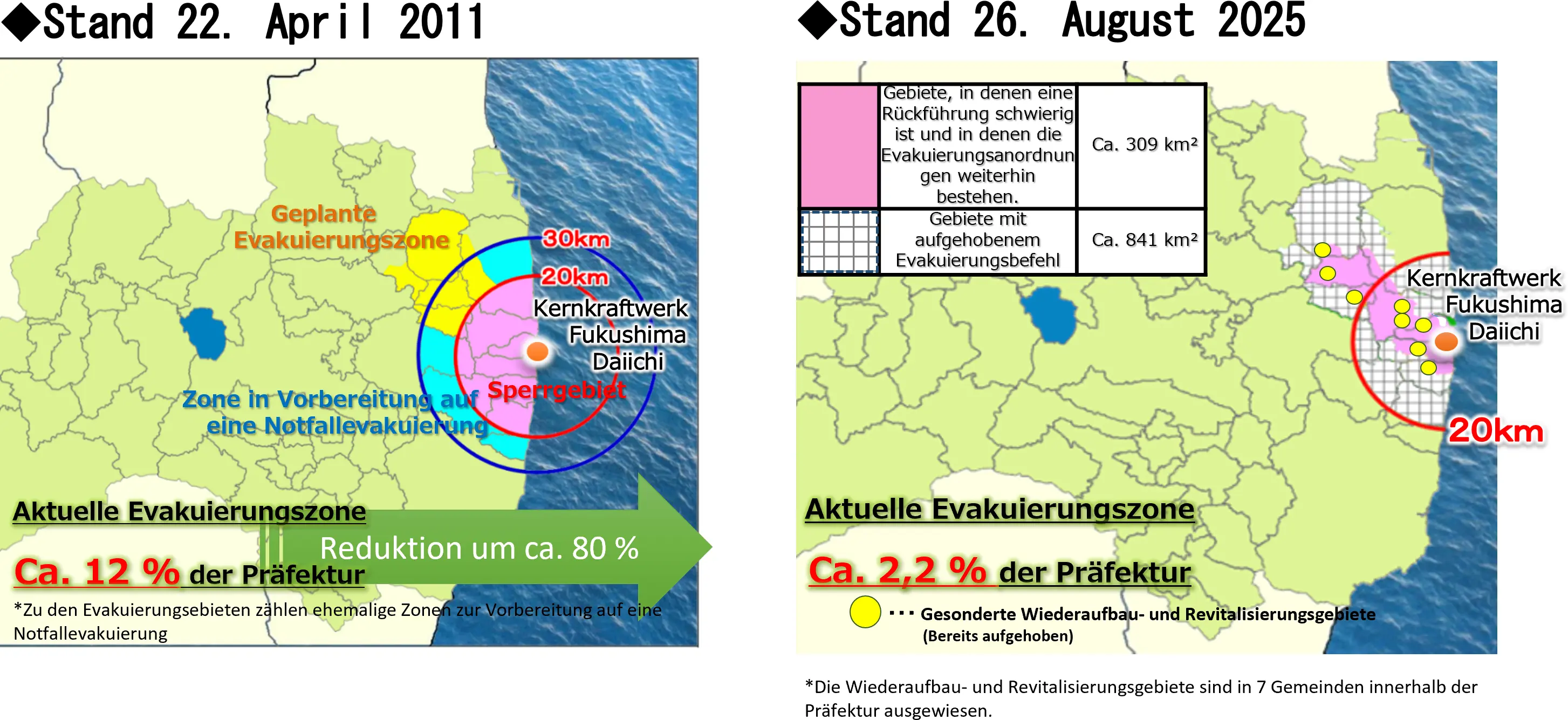 Verbesserte Bedingungen für Rückkehrende führten zur Aufhebung des Evakuierungsbefehls. Die Evakuierungszonen schrumpften von 12 % auf ca. 2,2 %.