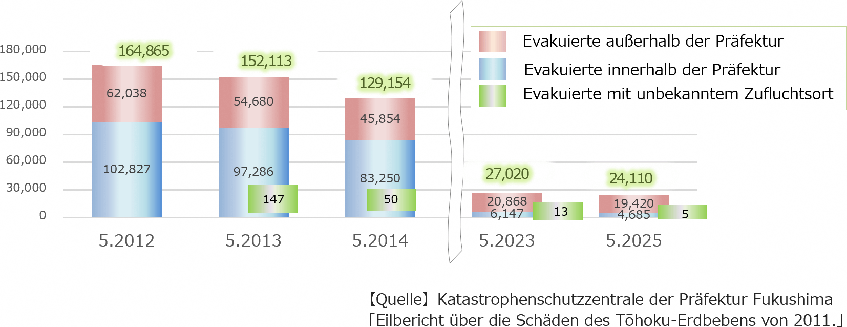 Die Zahl der Evakuierten ist seit dem Höchststand von 164.865 Menschen im Mai 2012 rückläufig. Derzeit sind noch ca. 24.000 Menschen evakuiert.