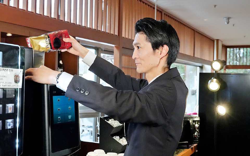 • ロビーの整備やコーヒーマシンの清掃など、お客様が快適に過ごせる空間づくりに取り組んでいます。ミーティングで、予約内容に間違いがないかを事前に確認し、連携を取りながら運営を行っています。