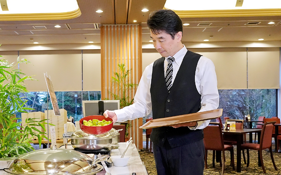 • 様々ですが、ビュッフェ会場では、バーカウンターでのドリンクサービスなども行っています。また、個室でのお食事は、一品ずつ提供するため、より丁寧で質の高いサービスを心がけています。